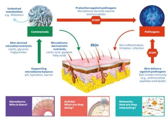 然而,如果我們不加選擇地去除皮膚表面微生物,同樣也會(huì)產(chǎn)生問(wèn)題。為什么呢?皮膚上不止有有害菌,同時(shí)也存在有益的細(xì)菌。這些細(xì)菌能夠分泌抗菌肽抵御有害微生物的入侵、加強(qiáng)和修護(hù)皮膚屏障等等。人們?cè)絹?lái)越認(rèn)識(shí)到良好的微生物和健康的微生物多樣性能夠給皮膚帶來(lái)多種益處。微生物與人體和諧共處,對(duì)維持整個(gè)皮膚生態(tài)健康至關(guān)重要。